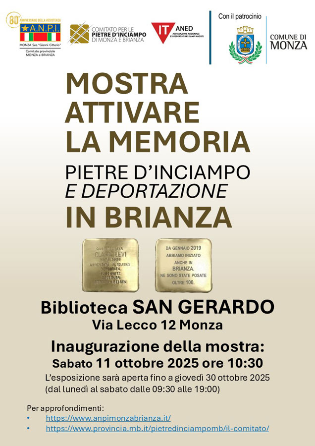Vi invitiamo a visitare la mostra "Attivare la Memoria", che sarà esposta dall'11 al 30 ottobre presso la sala della biblioteca "San Gerardo" in via Lecco 12 a Monza.