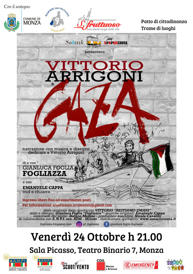 Per la prima volta arriva a Monza lo spettacolo di Gianluca Foglia "Vittorio Arrigoni a Gaza" (titolo originale: "VITTORIO - Restiamo Umani"), narrazione di teatro civile con musica e disegno dedicata a Vittorio Arrigoni. L'iniziativa è sostenuta da Anpi Monza, Anpi Monza Brianza, Arci Scuotivento, CGIL Monza Brianza, Emergency Monza Brianza, Monza per la Pace, con il contributo del Comune di Monza, Consulta San Fruttuoso, Associazione Culturale San Fruttuoso (Patto di cittadinanza - Trame di luoghi).