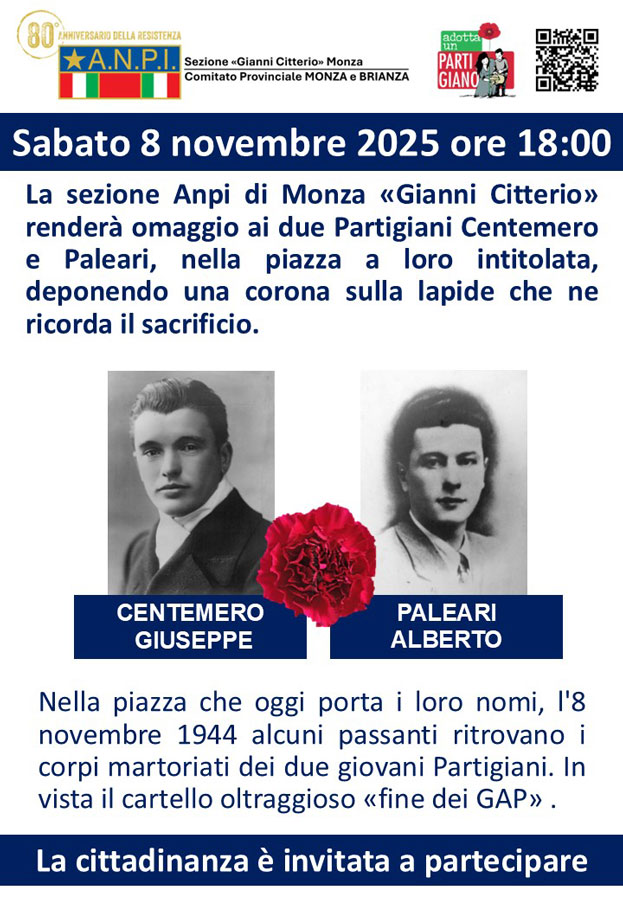 Poseremo una corona e ricorderemo la figura del nostro concittadino Gianni Citterio, Medaglia d'oro al Valor Militare, nella piazza a lui dedicata in corrispondenza della lapide.